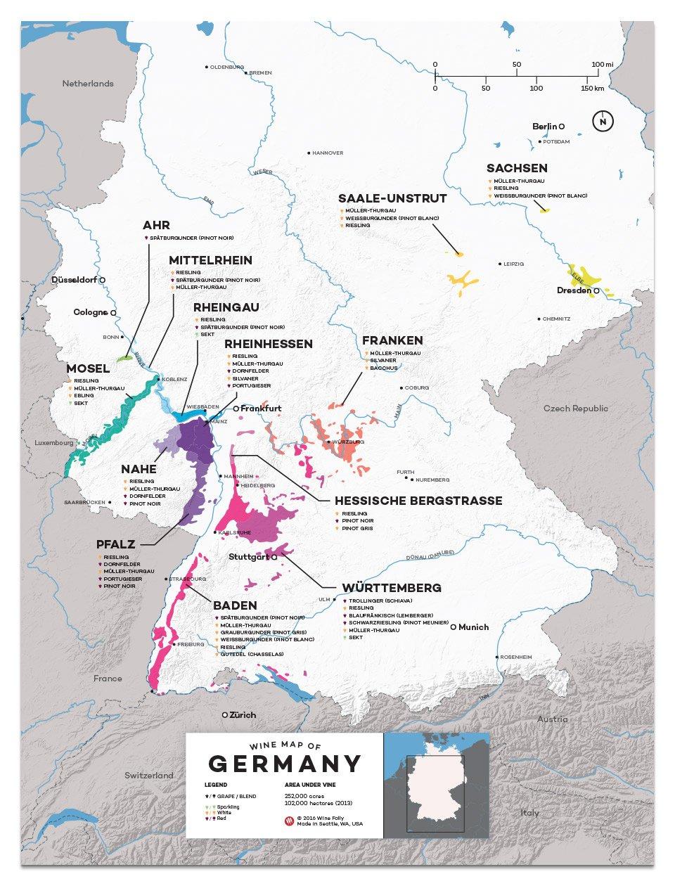 I vini sono tutti prodotti intorno ai fiumi, principalmente il Reno e i suoi affluenti, spesso riparati dalle montagne. I fiumi hanno effetti microclimatici significativi per moderare la temperatura. Il suolo è ardesia nelle valli ripide, per assorbire il calore del sole e trattenerlo durante la notte. Sulle dolci colline il suolo è dominato dalla calce e dall'argilla. Le regioni vinicole in Germania a cui ci si riferisce di solito sono le 13 regioni definite per il vino di qualità. L'industria vinicola tedesca si è organizzata intorno a queste regioni e alla loro divisione in distretti. Tuttavia, ci sono anche un certo numero di regioni per le categorie di vino da tavola (Tafelwein) e di vino di campagna (Landwein) raramente esportate, come si può vedere nella carta dei vini della Germania. Queste regioni, con poche eccezioni, si sovrappongono alle regioni dei vini di qualità. Per fare una chiara distinzione tra i livelli di qualità, le regioni e sottoregioni per i diversi livelli di qualità hanno nomi diversi di proposito, anche quando possono essere prodotti nella stessa area geografica.